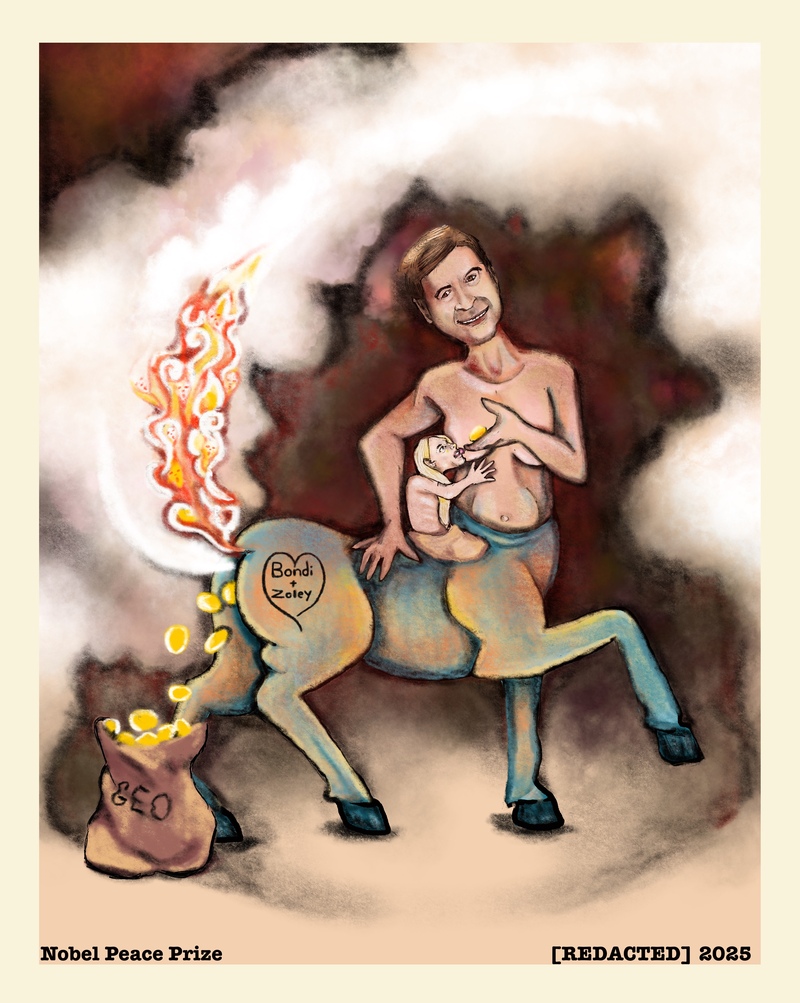 Portland vs. Bovino: Somewhere between the banal, the horrific, and the ridiculous, protesters expose the weak caricature of power worn by those whose policies are theatrical cruelty against other humans. Bovino sports a look featured by photographer Mustafa Hussein whose work I greatly admire, that can be seen here: https://www.mustafahussainofficial.com/ I wanted to strip Bovino of that gravitas so I added a Napoleon hand in jacket along with a medieval boob like helmet and a silly spear. Recently Bovino was admonished by a judge for lying to justify excessive use of force after claiming a rock thrown by protesters hit him on the head despite camera footage that proves otherwise.